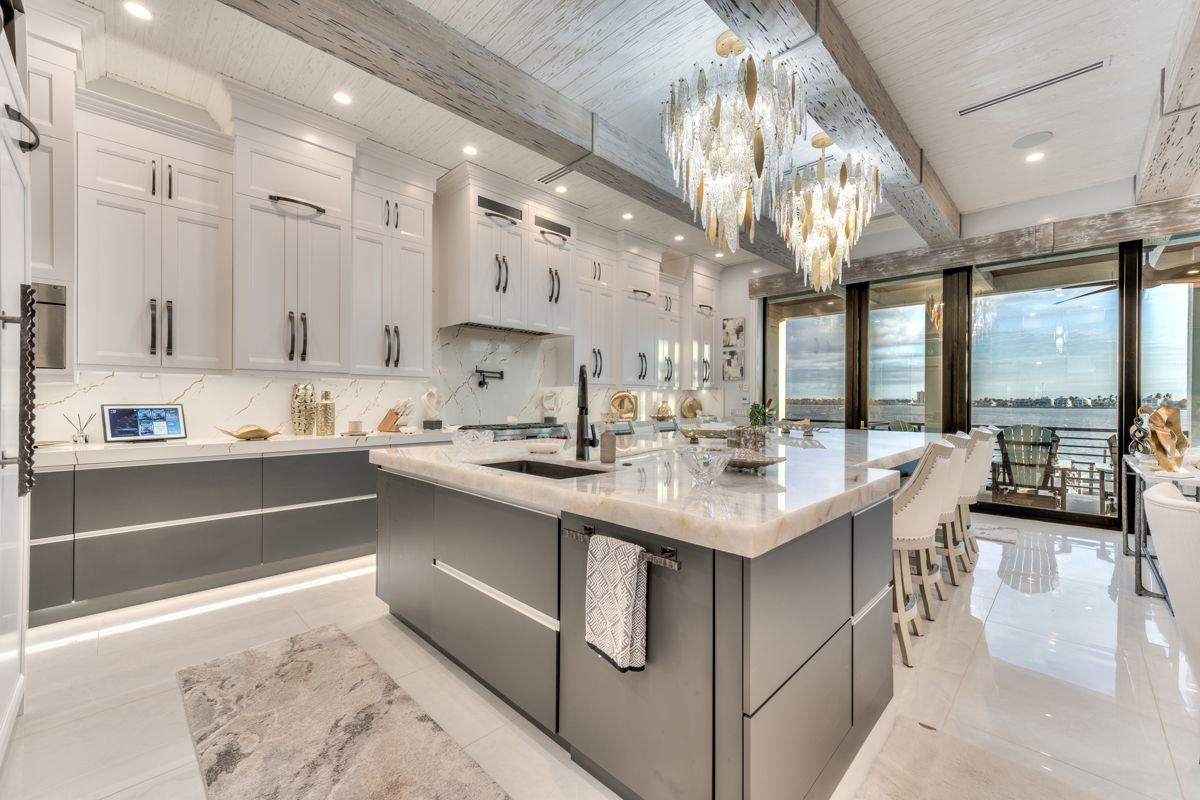 The gourmet culinary space is a showpiece, with a Wolf gas 6-burner stove, Sub-Zero panel refrigerator, quartzite surfaces, and integrated barista system. The living and dining areas are adorned with polished 24”x48” flooring, custom cabinetry, and unobstructed bayfront views. 2 guest bedrooms offer luxury en-suite baths, while all bathrooms are highlighted by quartzite counters, custom cabinetry, and spa-like showers. The owner’s suite features a hydrotherapy jet tub, walk-in wardrobe, and private balcony.