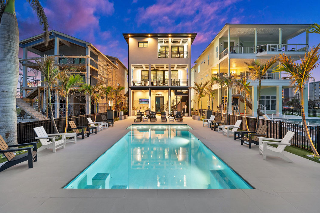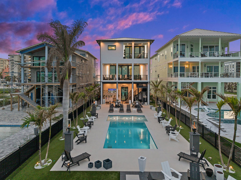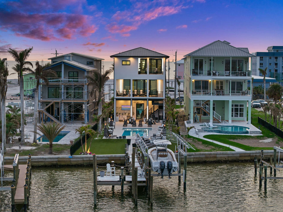 441 seamlessly merges modern luxury with coastal elegance while featuring 4 bedrooms and 4 bathrooms. This architectural masterpiece is designed for those who demand the unparalleled. Elevated to perfection, this home features 30-inch reinforced concrete slabs, PGT windows with advanced tinted glass, and a robust 24-gauge standing seam metal roof. The expansive bayside veranda offers panoramic views of San Carlos Bay and radiant sunrises. Inside, a symphony of curated details creates an ambiance of refined elegance. Architectural resin pecky cypress beam ceilings, monolithic quartzite slab surfaces, and Lauriermax cabinetry add depth and texture. A Sonos entertainment system, smart-controlled blinds, and a full-spectrum LED lighting design enhance modern living.